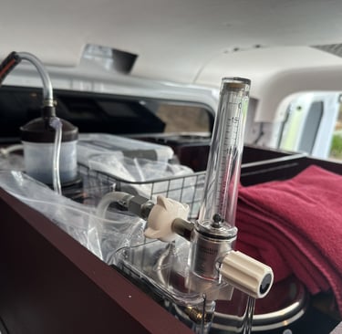 The vehicle is oxygen-ready; you must install an "E"-size medical oxygen tank from BOC gases. This tank is used mainly during transport between vet clinics and vet hospitals.
