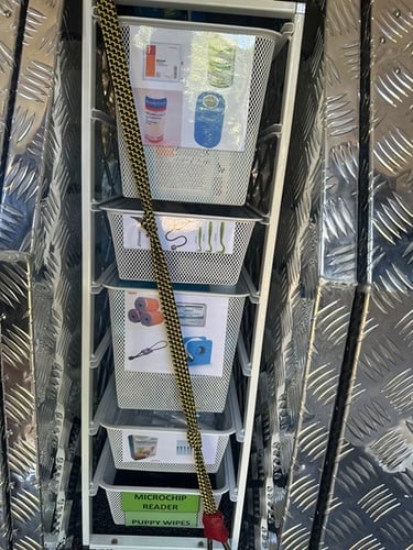 Inside, the vehicle was stripped of all the old Ambulance wiring to reduce weight (there was a lot of it). It was also thoroughly cleaned and sterilised before any work was started. Then the rebuild could begin. Three extra-large lockable cages were installed to ensure the comfort of pet patients at all times. Each cage has its own camera system, so the driver or passenger can observe the pet during transport.