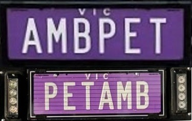 Two sets of personalised plates, "AMBPET" and "PETAMB," are provided with the ambulance. The AMBPET is currently fitted, and changing to PETAMB will cost $150 through VICROADS. You could then sell the other set that is not being used.